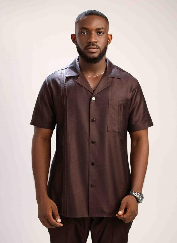 It features a camp collar, button-down style, and front pocket. The shirt’s design includes vertical pleats or subtle and a pin-tucks on the front of the pant