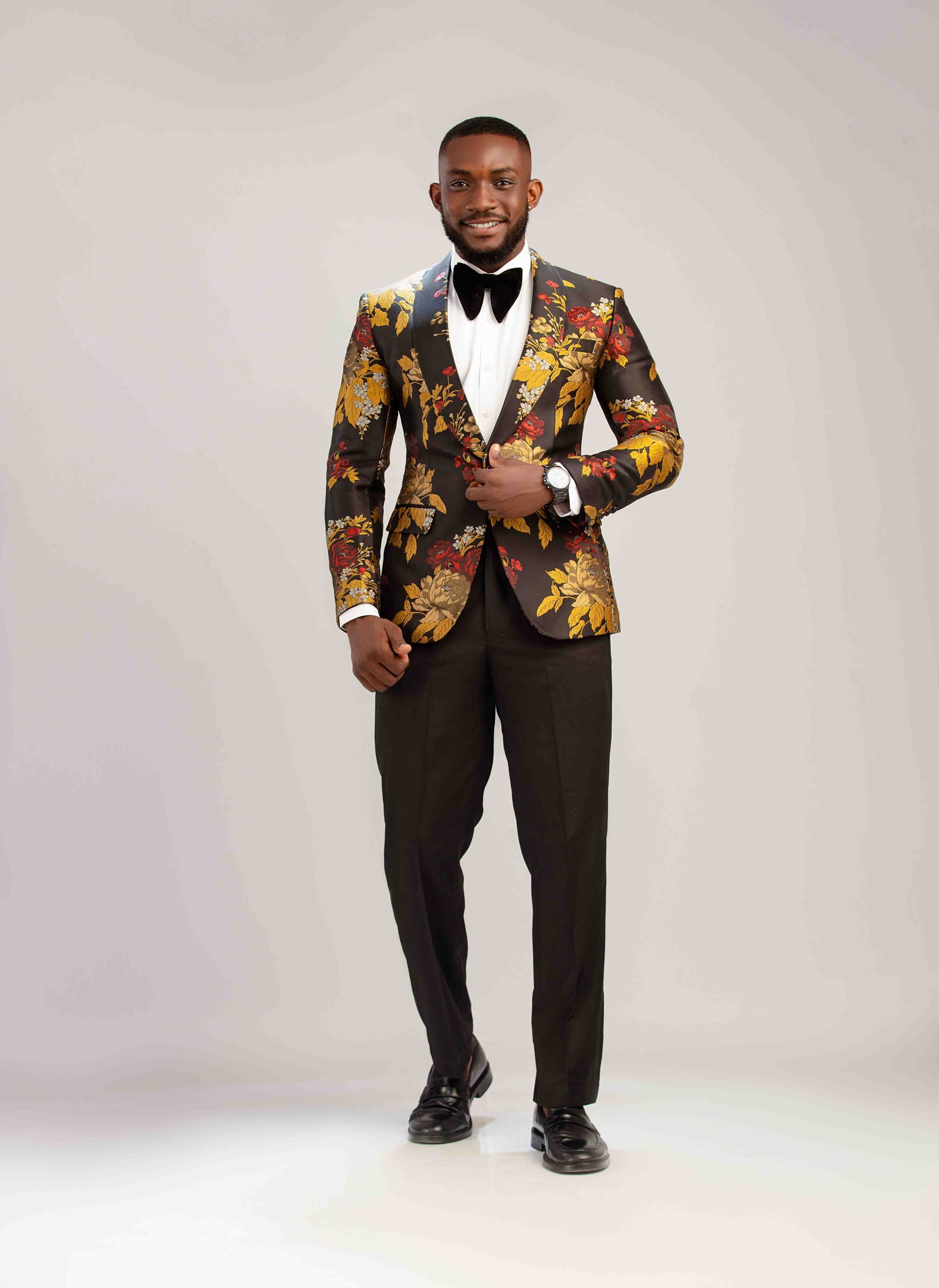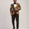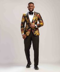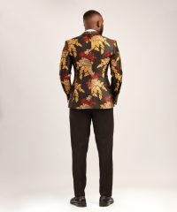 black base color adorned with a vibrant floral pattern in shades of yellow gold, red color with single-button closure and peaked lapels.