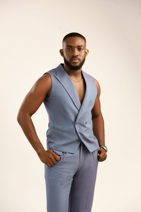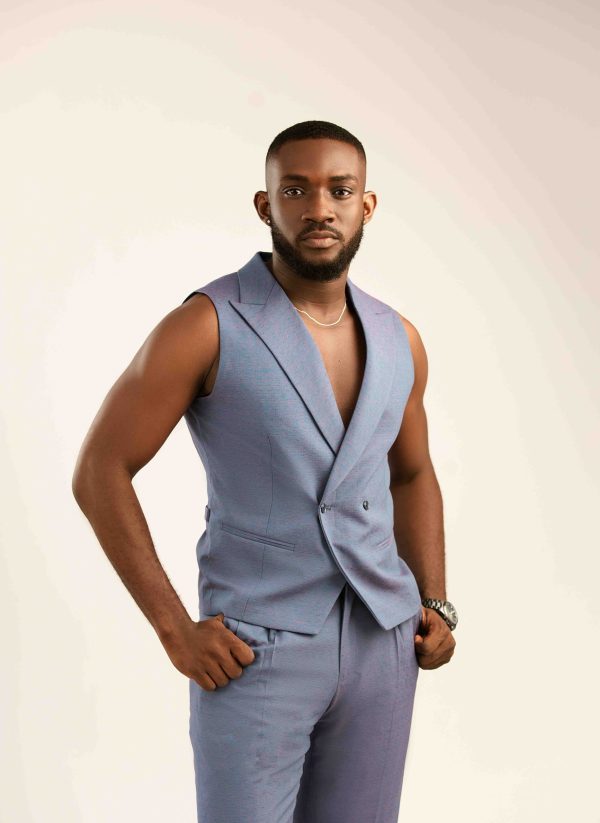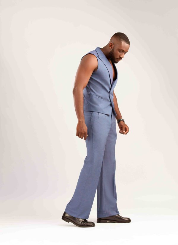 light blue sleeveless vest paired with matching wide-leg trousers in the same material.