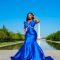 Blue Mikado structured cut out chest pieces corset dress with lace up back design.